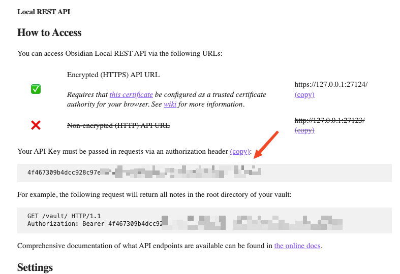 - Retournez dans Obsidian → Paramètres → Extensions de la communauté → Local REST API