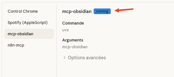 mcp-obsidiandans la liste et cliquez dessus - Si vous le voyez: running Configuration correcte!