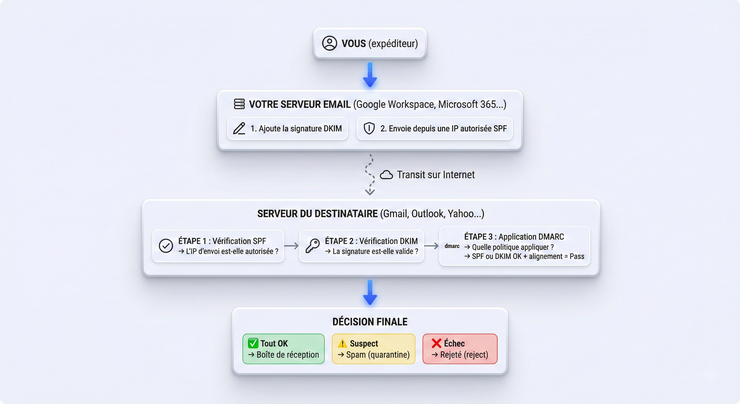 Si vous utilisez Google Workspace ou Microsoft 365, les emails internes restent sur leurs serveurs et ne passent pas par les vérifications SPF/DKIM/DMARC de la même manière. Mais dès qu’un email sort vers un destinataire externe, toutes les vérifications s’appliquent.
